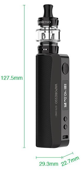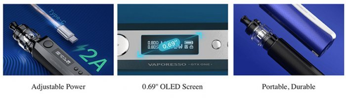Grip Vaporesso GTX ONE se prezentuje vestavěnou baterií o kapacitě 2000mAh s rychlým 2A USB-C nabíjením a nastavitelným výkonem až 40W. Propracovaná konstrukce gripu disponuje přehledným 0,69 palcovým displejem a pohodlným spínacím tlačítkem. Mezi jeho další přednosti patří ochrana proti zkratu, přehřátí a nízkému odporu. Všechny fanoušky MTL a DTL vapování potěší přiložený clearomizer GTX Tank s vrchním plněním, objemem nádržky 3ml a žhavicími hlavami GTX o odporu 0,8ohm a 1,2ohm. Celý clearomizer je plně rozebíratelný = snadná údržba. Regulace přívodu vzduchu pro nastavení optimální kouřivosti se nachází ve spodní části.